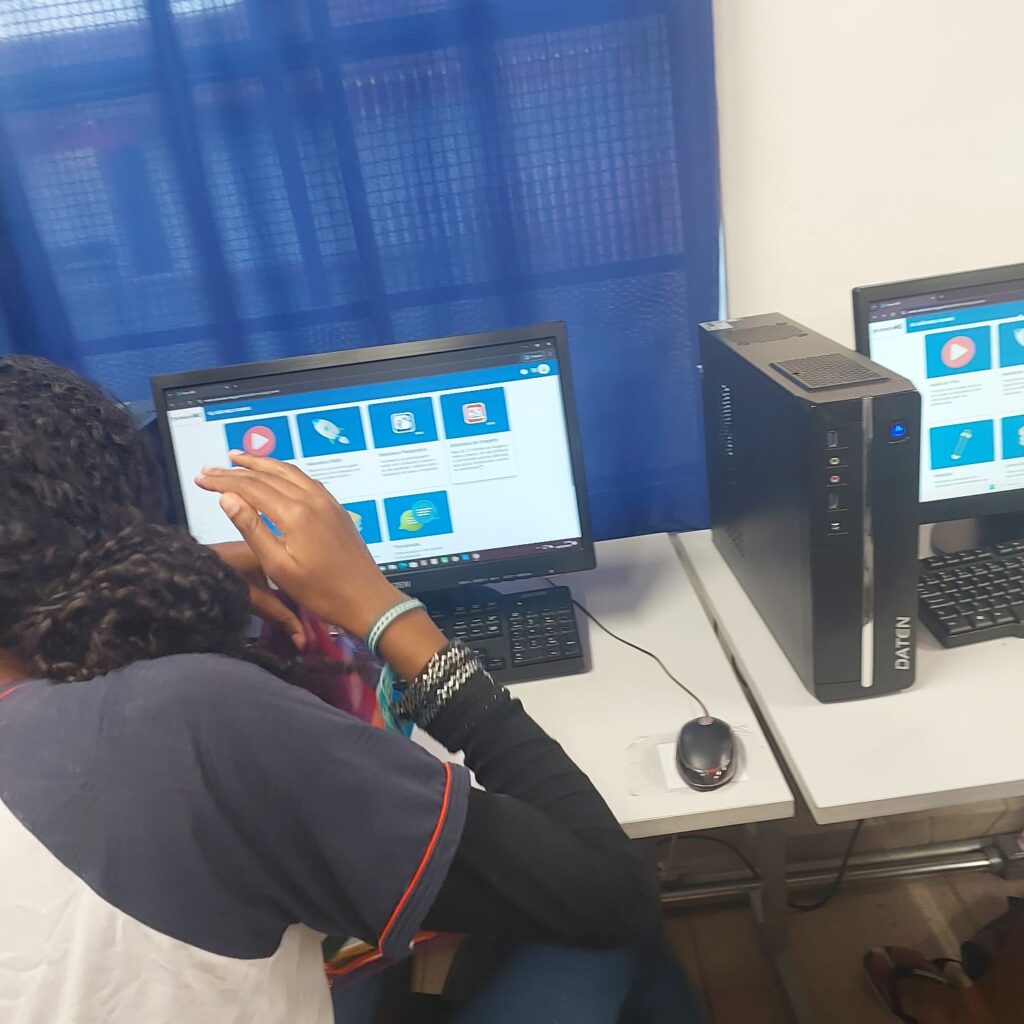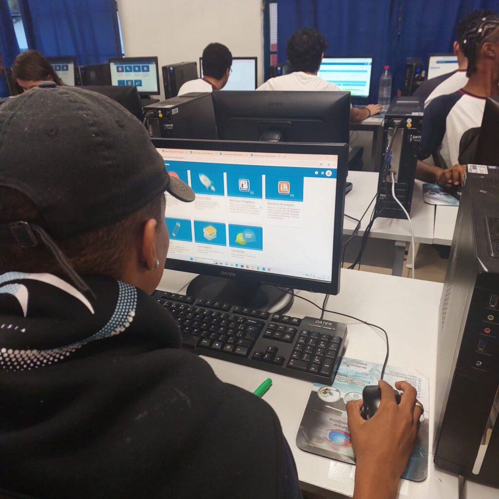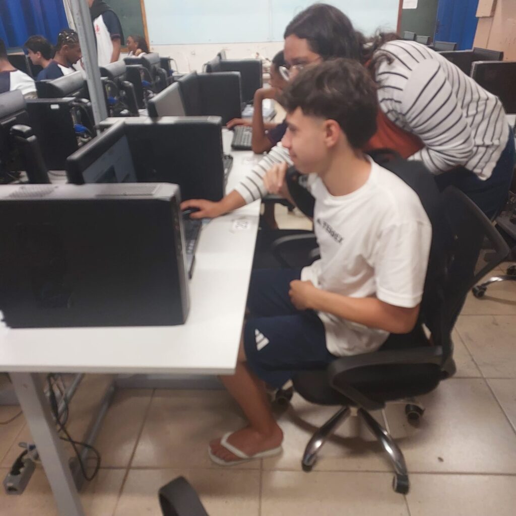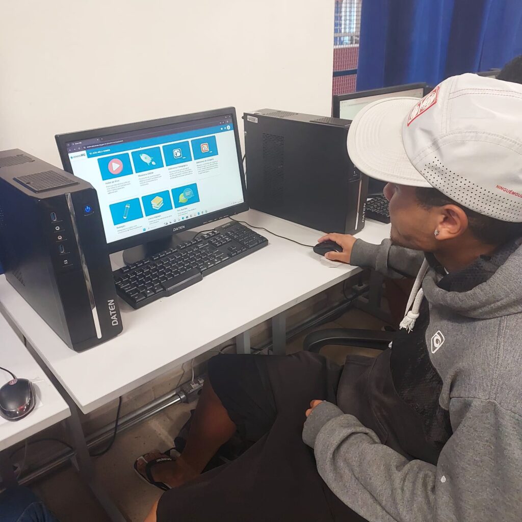 Os professores da disciplina Tecnologia e Inovação levam os alunos no laboratório de informática e auxilia-os no acesso e aproveitamento das atividades na plataforma .